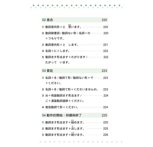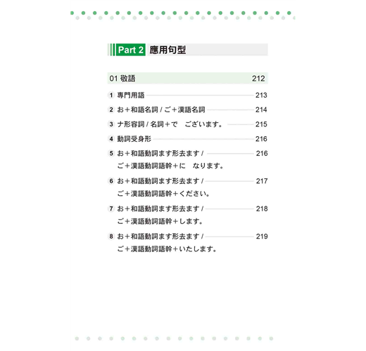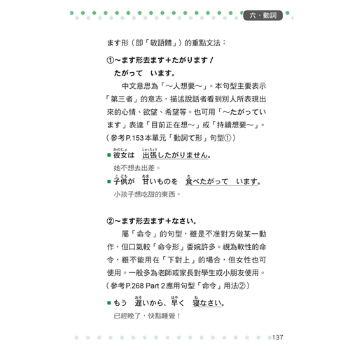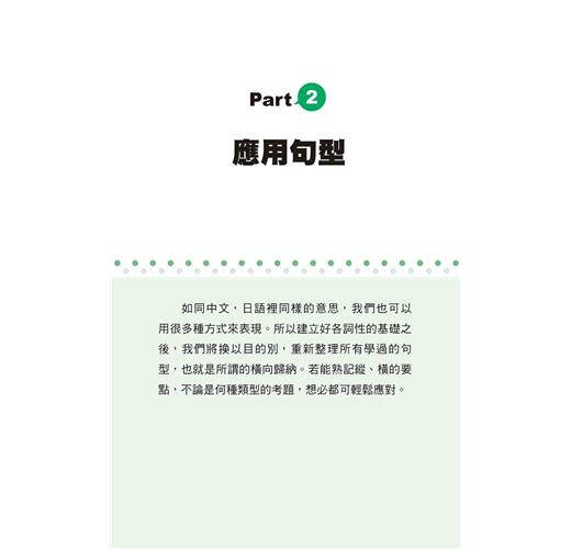 有了初步的文法基礎後,接著再配合本書歸納的「敬語」、「意志」、「委託」、「能力」、「許可」、 「授與」、「條件與假設」、「推測與判斷」……等應用句型,奠定更加深厚的文法實力,日語就可運用自如。