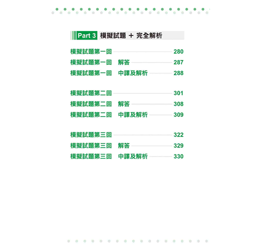 在研讀完句型及文法之後,可利用3回模擬試題測驗自我實力,並對照解答與解析,補強不足之處。