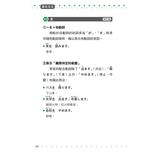例句豐富實用,幫助了解文法、句型的結構與變化。