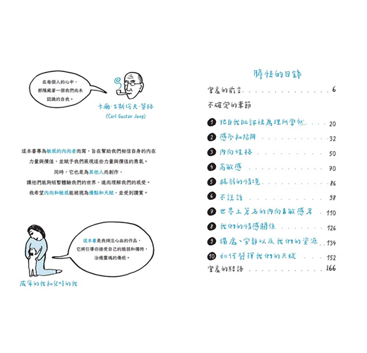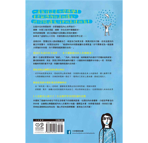 這樣的你,習慣在別人面前隱藏自己,希望自己能更活潑、更勇於對外行動。但來自捷克的圖文作家蘭卡.布拉杰熱娃想告訴你:「敏感和內向特質會讓你走得更遠!你不需要成為一個適應力很強的外向者,你只需要發掘真實的自我。」