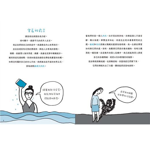 蘭卡一生都在學習如何與「敏感」、「內向」性格共處,她將敏感內向者的千百種糾結與感受,畫成線條鮮明、奔放、誇張又帶有黑色幽默的圖文。她用富有想像力的筆觸,重現敏感內向者的腦內小劇場,記下每一個令人羞赧、想挖洞躲起來的時刻,以及每一幅思緒翻騰的內心風景。
