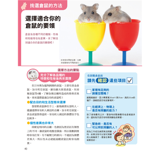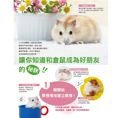 體型稍大、個性溫和的黃金倉鼠比較容易照顧,適合初次飼養寵物鼠的人,如果想飼養寵物鼠中的人氣王——小巧可愛的加卡利亞倉鼠、羅伯羅夫斯基倉鼠等侏儒倉鼠,並且和牠們長久過著愉快的生活,那就得先了解牠們的習性。