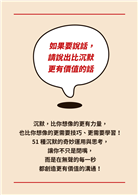 本書精選51種「沉默的技巧」,教你如何用刻意安靜的一瞬間,讓話語更有力量。重點不在於「用沉默取代言語」,而是「有策略性地調整語言分量,將沉默當成一種有效的說服手段」。