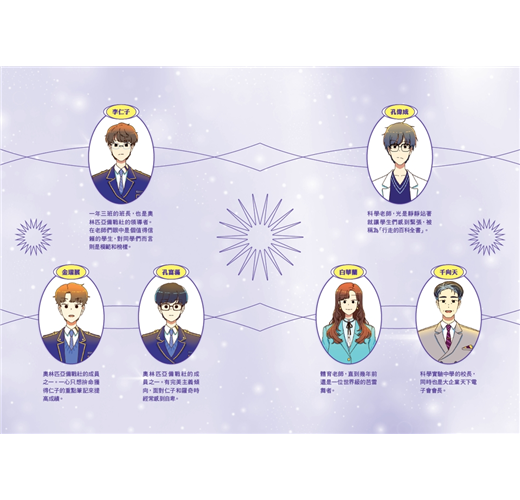 比起解謎的天才,這些人物更像是我們會在周圍遇到的平凡同學。一旦陷入沉思、不管被誰拉走都不知道的羅奇;比起用腦,更喜歡用肌肉解決問題的志洙;精通各式小說漫畫,充滿想像力的金瑟;喜歡科學和老掉牙笑話的智伍;還有為芭蕾不惜付出一切的莉娜。其他老師和同學們也充滿個性,為不同的理由阻礙或協助主角們,為這趟尋找隱藏答案的旅程增添豐富的色彩。