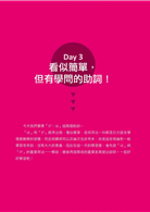 本書為了讓讀者在學習上一次到位,特別在每一天的最後設置練習單元,將每一天內所學的助詞打散,讓讀者交叉練習,測驗學習成效,即刻補強不足之處!