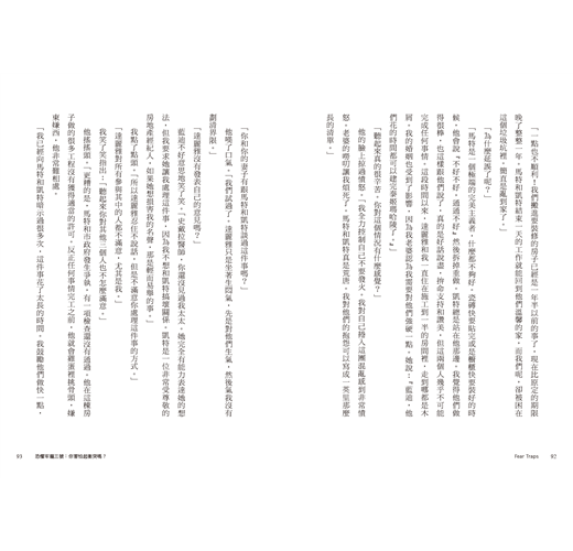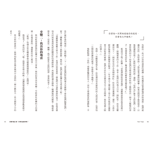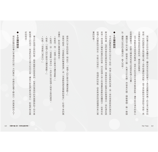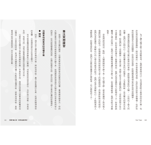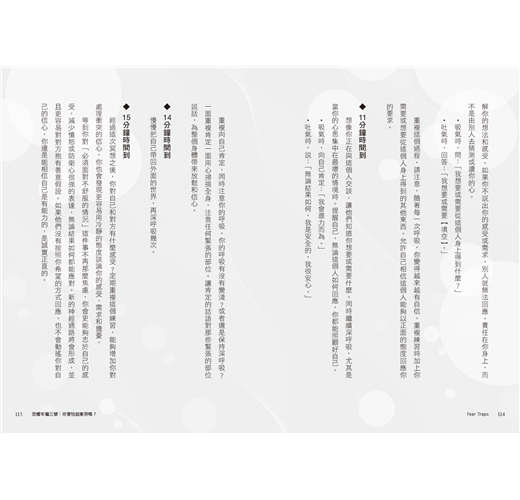 2. 克服六種常見恐懼的六步驟自救法:害怕失敗、孤獨、未知、衝突、被拒絕、被忽略,以六個案例,說明六個具體步驟,打破舊模式,找到應對的新模式。
