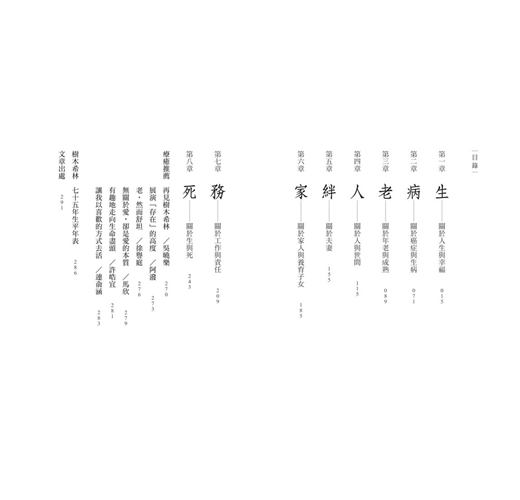 本書集結樹木希林畢生訪談精華,以生、老、病、死等人生普遍會經歷的課題為中心,編纂而成。在書裡,樹木希林以直白的口吻,回應「何謂幸福」、「演員之道」、「對婚姻的看法」、「與子女的相處」等種種關於生命日常的提問,一如她在電影裡看似不經意卻直指人心的台詞。
