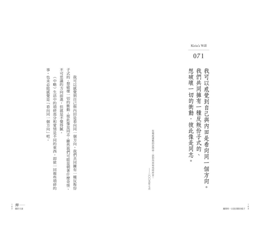 我很喜歡這本書。一方面是每個篇章都短短的,讓人很好消化;但這些短短文字又帶有很重的分量……我們只是透過她說的話來「為自己原有的心智找到出路」。──許皓宜/心理諮商師