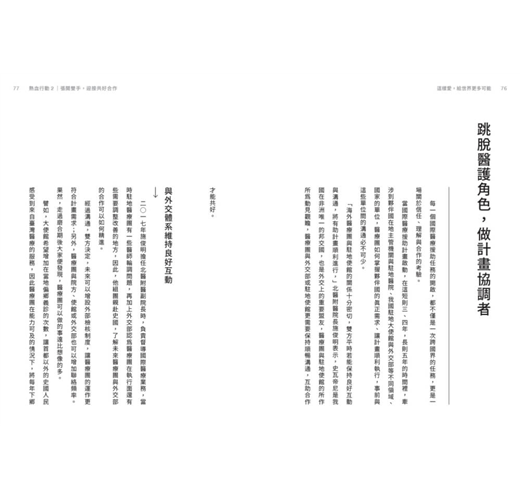 這本書詳細爬梳北醫二十年來的國際醫療援助經驗,同時彙整切實可行的執行模式,透過實際案例分享,讓外界認識北醫在國際醫療上的能力及行動力,立下北醫執行國際醫療援助計畫的典範地位,並傳達一所醫學大學的教育理念。