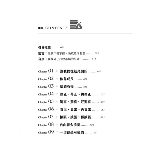 股市投資,是一埸對經營者內容和自己判斷思考的數字和非數字之觀相識心漫長歴程,作者在書中列舉的八個高勝率選股重點,幾乎和我走訪請益中,從數字端詮釋公司內容完全相同,讀者細讀,必有所得。