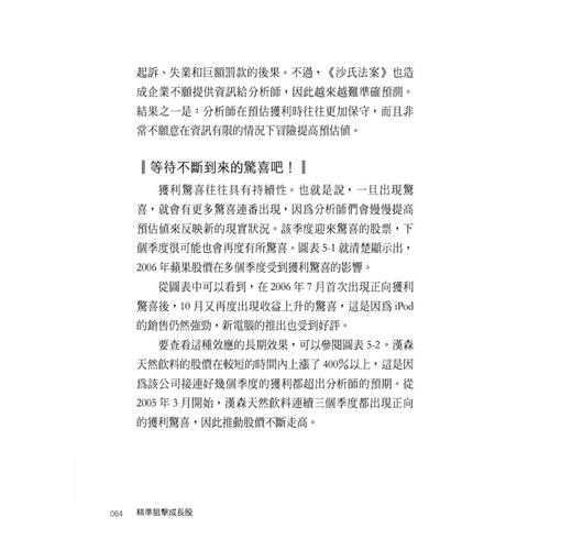 獲利驚喜往往具有持續性。也就是說,一旦出現驚喜,就會有更多的驚喜連番出現,因為分析師們會慢慢提高預估值,以反映新的現實狀況。該季度迎來驚喜的股票,下個季度很可能也會再度有所驚喜。圖表5-1就清楚顯示出,2006年蘋果股價在多個季度受到獲利驚喜的影響。