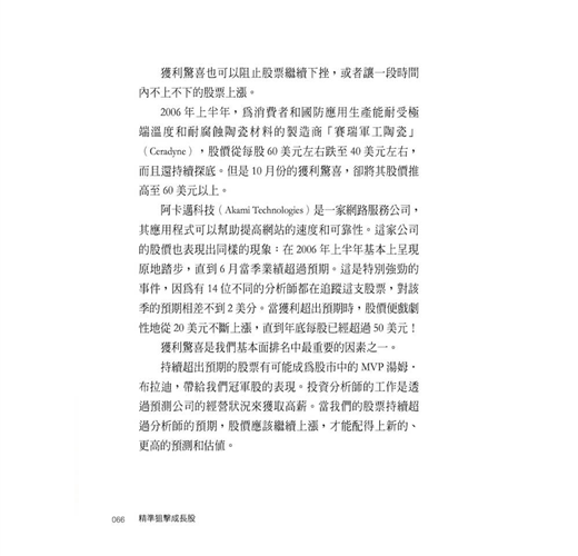 展現獲利驚喜的股票,是成長型股票領域的超級巨星。就像湯姆・布萊迪(Tom Brady)在國家美式足球聯盟(National Football League, NFL)第六輪選秀中脫穎而出,不僅贏得3次超級盃,其中2次還當選最有價值球員(Most valuable player, MVP),或者是像托尼・羅莫(Tony Romo)從坐板凳替補上場,到帶領達拉斯牛仔隊(Dallas Cowboys)在2006年重返季後賽一樣。這些股票超出華爾街分析師的預期,他們追蹤這些股票,目睹到這些股價快速上升。