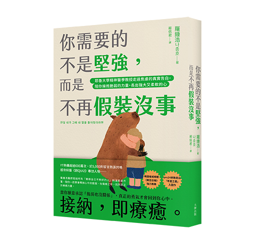 《你需要的不是堅強,而是不再假裝沒事》是一本有關「鼓起勇氣,擁抱脆弱」的書籍,也是充滿希望的臨床紀錄,記載了在這個只追求幸福與完美、令人窒息的世界上,如果你願意把自己的「憂傷」與「焦慮」攤在陽光下,會帶來什麼樣的變化。感謝羅鍾浩醫師願意率先分享他的脆弱,以及他年輕的時候,每時每刻都在惴惴不安的「廣泛性焦慮症」時期,還有他作為一位亞洲移民者所經歷過的認同強迫症時期,與其他讓人深感共鳴的回憶。