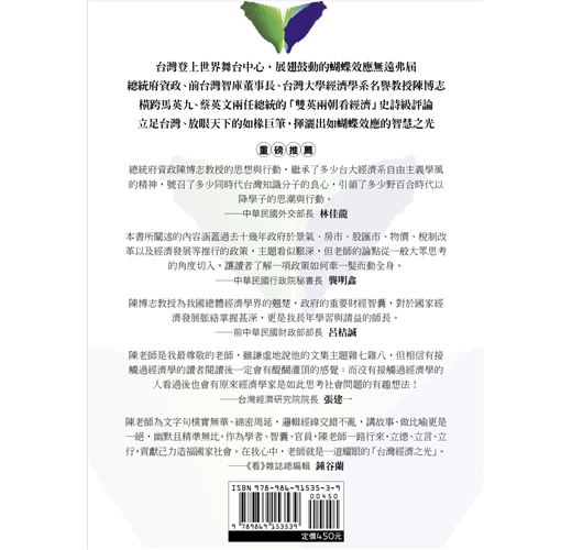 陳老師的厲害之處在於,他可以將極複雜的經濟理論,用相當簡單的小故事讓沒學過經濟學的人都可以輕易地了解。本書所闡述的內容涵蓋過去十幾年政府於景氣、房市、股匯市、物價、稅制改革以及經濟發展等推行的政策,主題看似艱深,但老師的論點從一般大眾思考的角度切入,讓讀者了解一項政策如何牽一髮而動全身。