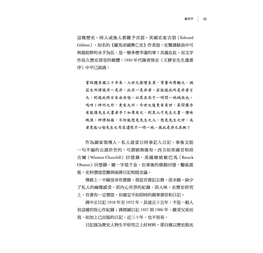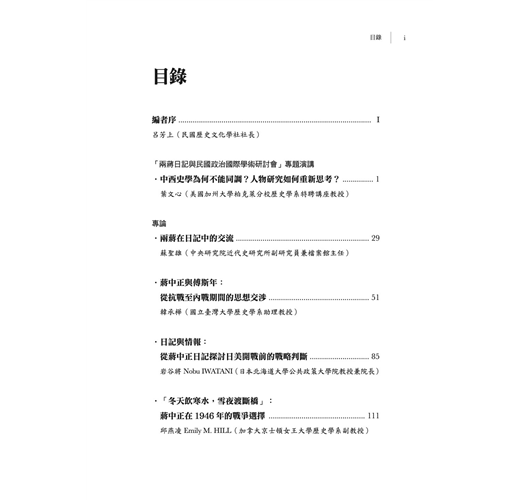 本書先由葉文心教授談中西史學發展的問題,與兩蔣日記出版後人物研究的不同面向。再由八位學者,分就家事、人事、軍事、政事等議題,利用兩蔣日記,深入探究兩蔣對民國的影響。最後由兩位學者,討論經濟與外交的可能思考方向。