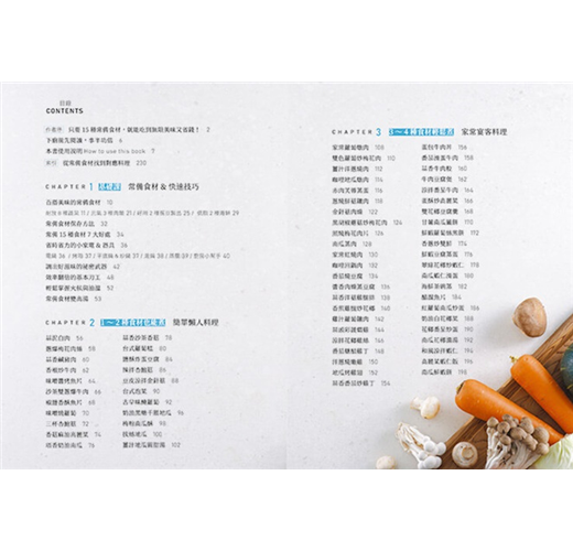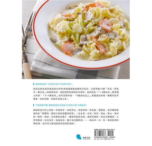 型男主廚吳秉承以35年經驗,精選15種「常見、好保存、變化多」的萬用食材,搭配簡單調味和辛香料,輕鬆煮出80道主食、主菜、配菜、湯品、點心。從蒜香番茄炒雞丁、海鮮茶碗蒸、南瓜花椰濃湯、三杯杏鮑菇、台式泡菜、拔絲地瓜、薑汁地瓜圓甜湯……,中、台、日、韓風味一次滿足,無論三餐或宴客都適用。最適合想減少採買、提升效率、冰箱整潔控與喜歡玩風格料理的你!