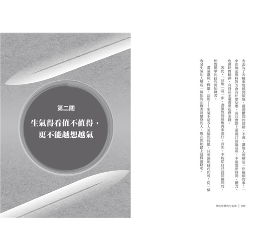 啊……,真是受夠了!生活裡到處都有壓力,不是嗎。在這樣的日子裡,誰又能說我們「不可以生氣」?生氣也無妨!或許很難想像這句話竟然會出現在佛教書籍中。然而,這恰恰反映出許多人的心中懷著各種不滿情緒。無論是令人困擾的陌生路人、工作、家務、育兒的煩惱、還是揮之不去的過去、對未來的焦慮不安,抑或是生活的艱辛,這些全都源自怒氣;但我希望你能克服這些憤怒。