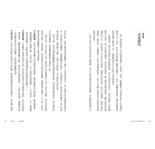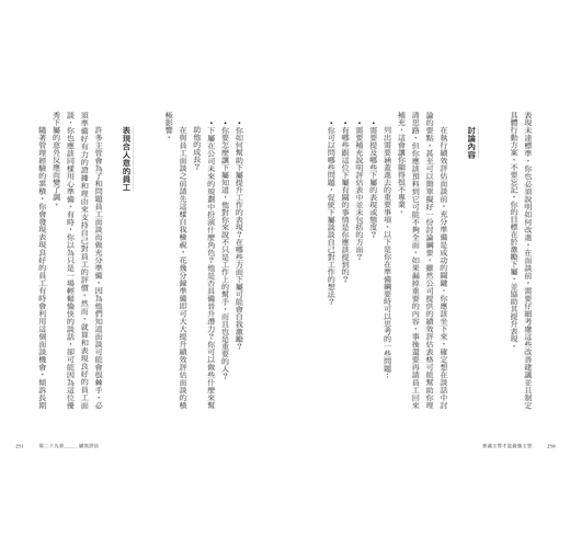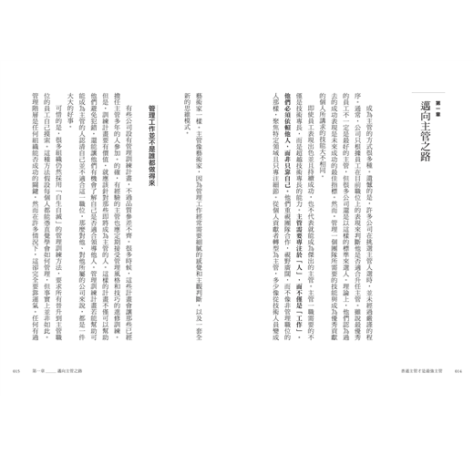 「本書最吸引人的地方在於,它不只是停留在理論層面,而是透過真實職場中的故事與失敗經驗,深入淺出地提供貼近實務的建議。例如,剛成為主管時常犯的錯誤——『過度展現權威』、與部屬之間的『距離拿捏困難』、甚至是『朋友變部屬時的應對方式』等,書中涵蓋許多讓人不禁點頭說『我也是!』的真實情境。」