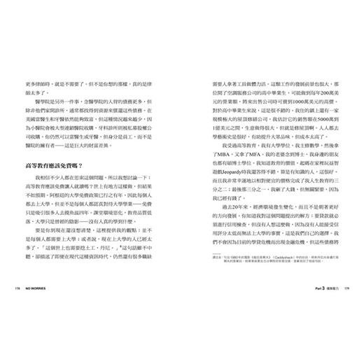 所以只要能避免錯誤的負債且承擔正確的風險,那人生還有什麼好擔心的呢?想像你的人生只需在三件事上煩惱錢的事——買房、買車、上大學——其他的時間,根本不用擔心錢的事。