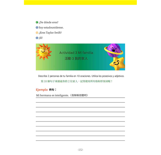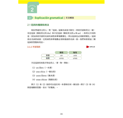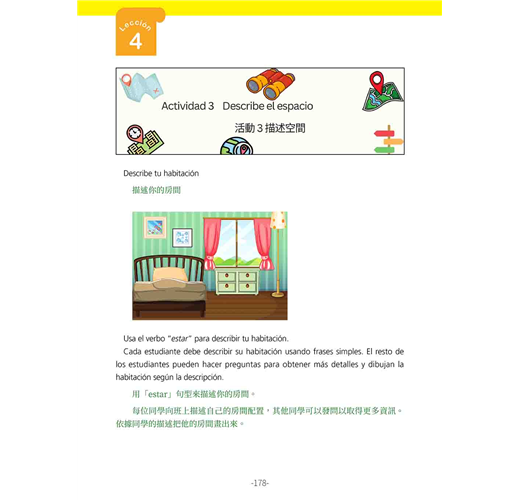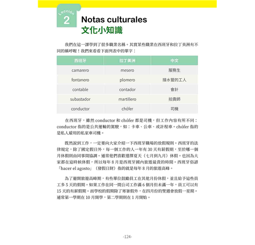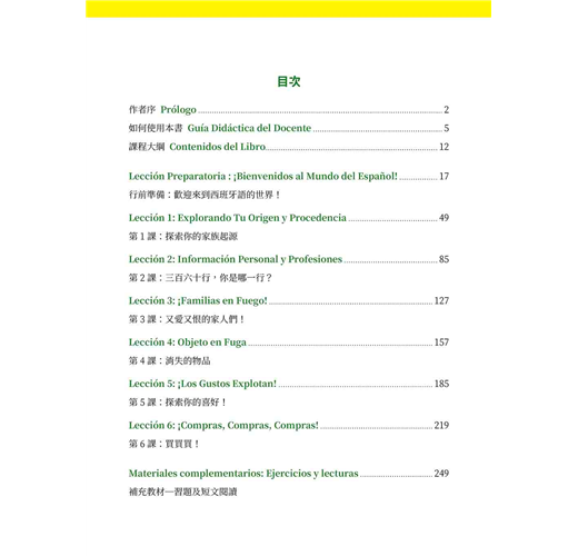 全書以西班牙文與中文雙語搭配,不僅能學習語言,還能理解其背後的文化與表達方式!西班牙文部分可以幫助教師掌握教學方向,中文部分則為學習者準備了詳盡的解說,方便隨時查閱。