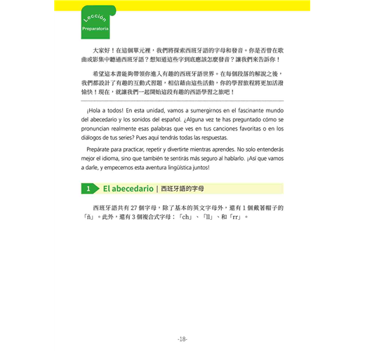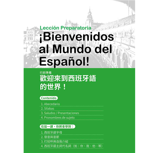 本書從「Lección Preparatoria行前準備」先帶你認識西班牙語字母,接下來共有6課學習內容,帶你透過會話及課後活動,深入認識更多詞彙及文法,絕對是你入門西班牙語的必備工具!