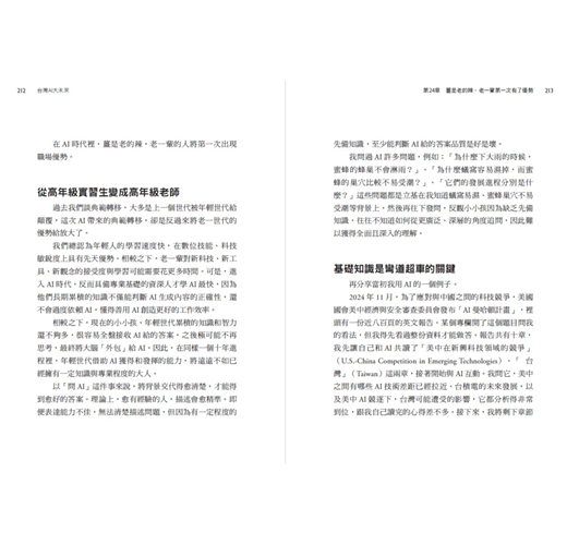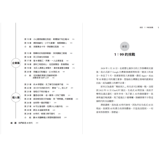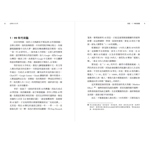 書中闡明AI發展趨勢中潛在的危機,無論是AI技術集中化、數位化落差,還是企業應用AI的速度快慢,書中都明確指出各種挑戰,同時鼓勵讀者抱持開放心態,積極使用AI。