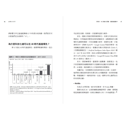 人們說,21 世紀的石油是數據,現在我們可以更進一 步地說,半導體也等同於未來石油。原因在於,有人認為 Nvidia 的產品賣得太貴,導致 AI 產業無法規模化,畢竟很 多應用是買不到 GPU 就沒辦法擴展。AI 模型的訓練、推論 太耗算力,因此 AI 要想規模化,有賴於半導體技術與設備 持續突破、壓低成本。