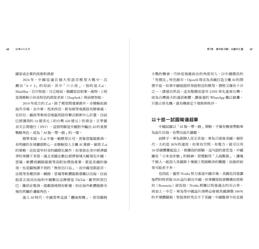 本書一大特色是其全面且總體的分析,不僅從國際地緣政治的戰略高度,探討美中分流下的台灣機遇,還深入台灣企業各層面的變革,討論AI轉型中的實務議題,讓讀者從不同角度理解AI帶來的影響。