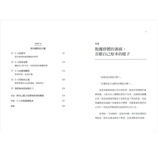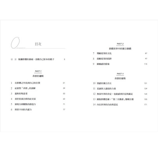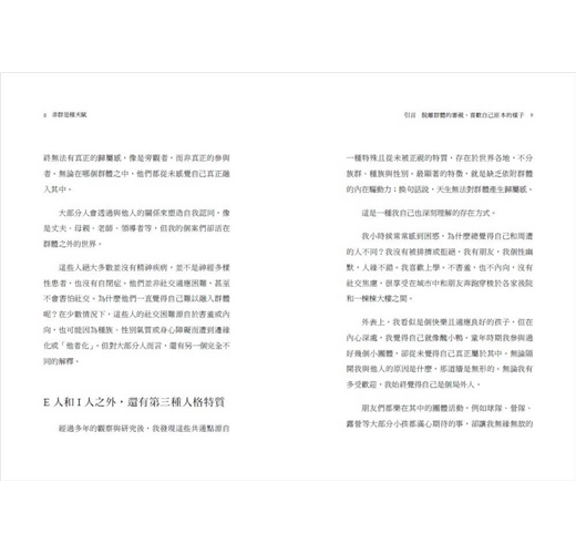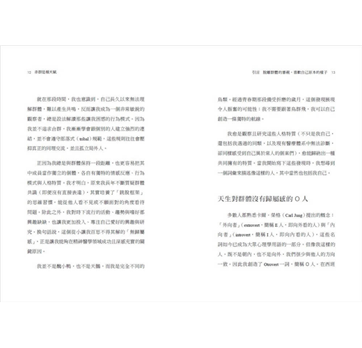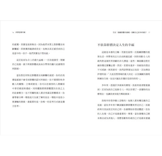 本書作者為精神科醫師,從學術研究、政府部門到公共服務,在四十多年臨床經驗中觀察到,除了渴望成為群體一部分的內向者(I人)與外向者(E人)之外,還有第三種類型:對群體沒有歸屬感的O人。