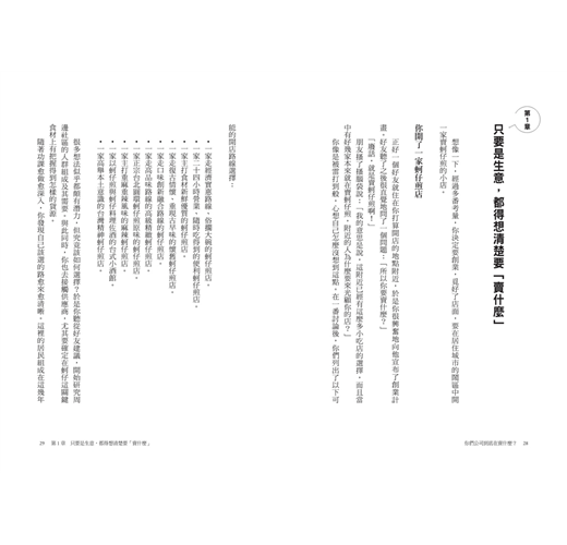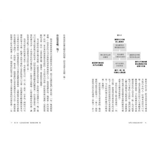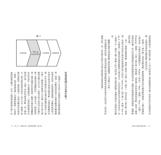基於以上想法,我這樣安排了書中內容:第一部先建立你的核心策略觀念,第二部則一步步告訴你如何準備與發展策略,然後第三部會提供你一些重要好用的工具,最後在第四部教你怎麼「包裝」策略來成功說服老闆、客戶或同事,讓你的策略成為大家的共識──加起來就是一句話:幫你想清楚你要「賣什麼」然後把想法賣掉。