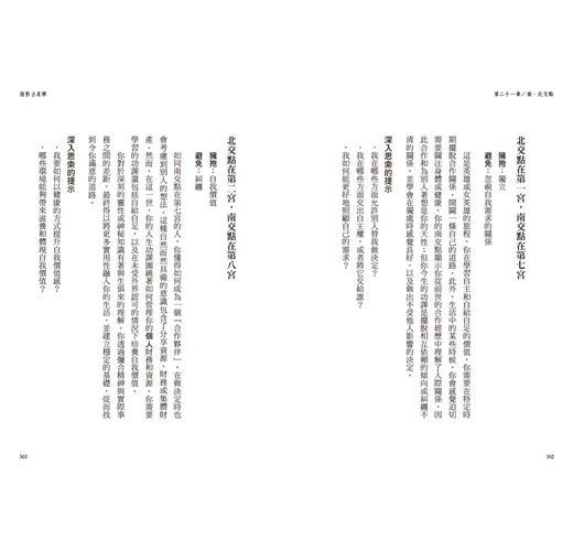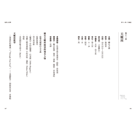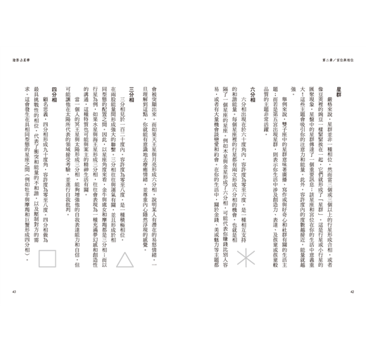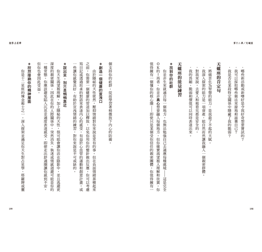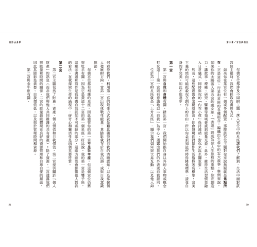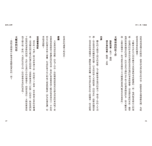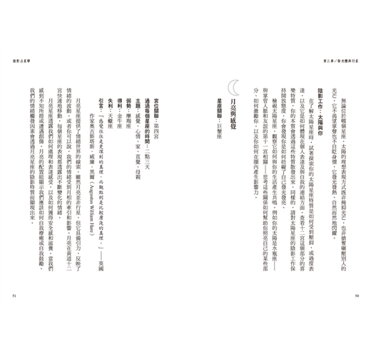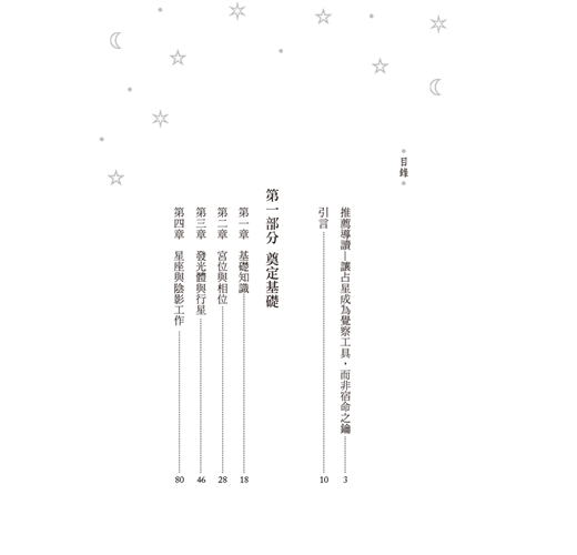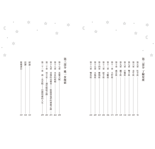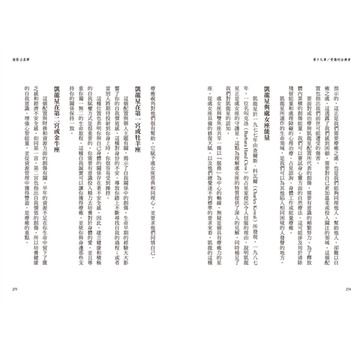 書中每一章都提供了指南針式的標題,舉出一個具體概念。當你對某個標題感興趣,例如你對凱龍星或天蠍座的轉化特質感到好奇,那麼在理解該章節的大致內容之後,盡可以進一步地去延伸學習。