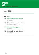 透過PART01「輕鬆學好越南語元音字母+輔音字母」,已學過264個單字、264個詞語、264個例句,在進入到PART02後,擴大延伸進入「實用情境會話」。本單元有「問候」、「介紹」、「寒暄」、「家人」、「物品」、「數字」、「時間」、「地點」、「娛樂」、「生病」10種情境,實現越南語的會話環境。每個單元皆有4句適合初學者使用的會話短句以及句型說明,並補充相關例句,充實腦內單字、會話的寶庫。