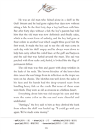 希望今天晚上會有隻飛魚跳上船,可是我沒有燈光去引誘牠們。飛魚生吃是再好不過的,而且不需要用刀子切。我現在必須盡量節省體力。天啊,我沒有料到牠是這麼的龐大。」