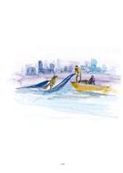 這時,還沒看到釣索在水中的斜度有改變,他的右手就感覺到拉力有些不同了。接著,就在他彎身去支撐釣索,左手用力在大腿上拍打時,他看到傾斜的釣索緩慢地往前升起。