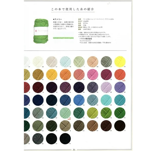 本次使用HAMANAKA的Amerry線材,同時滿足「並太」規格粗細,以及多元且完整的色票,是編織配色作品的最佳選擇。