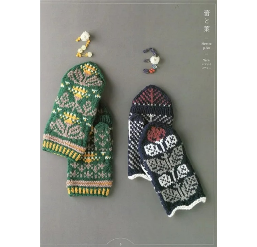 綠底色上襯配色蒲公英手套,以雙色螺紋收口;深藍背景中浮出的紅花與灰葉手套,不特別收口,自然呈現波浪狀。