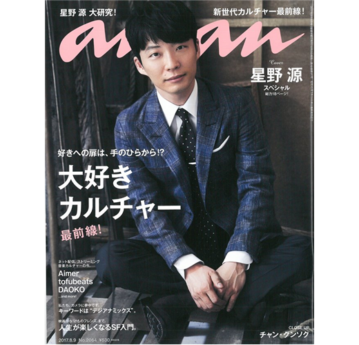 星野源大研究以飾演日劇「月薪嬌妻」裡的專業單身漢平匡一角,知名度直線上升的星野源,其實不只是名成功的演員,他同時也是歌手、音樂人、作家…等,以多重身分活躍於演藝界。才華洋溢的他,雖然算不上是傳統定義的帥哥,但笑起來的樣子十分迷人,豐富內涵更讓人著迷不已。星野源到底哪裡與眾不同?他魅力的來源又是什麼呢?本期an・an為大家帶來10頁專訪加特寫,讓他來談談自己。再提供8頁的星野源研究,從他喜歡的音樂、自己的單曲作品、廣播節目、著作…等層面,來分析這位人氣明星的獨特之處。