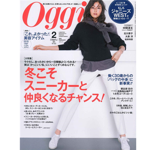 卷頭企劃帶來冬季時尚球鞋穿搭,接連提案示範多套帥氣又漂亮的球鞋造型,並推薦絕對安全不出錯的「白.黑.灰」三色球鞋,以及歐美名媛也愛穿的名牌球鞋新品速報。另公開多位上班族OL的包包&化妝包內容物,還有Oggi嚴選2018年度最佳美妝保養品大賞結果發表。卷末西裝男子妄想劇場由傑尼斯偶像Johnnys' WEST化身公司職員,展開一連串讓人心跳加速的辦公室小劇場。